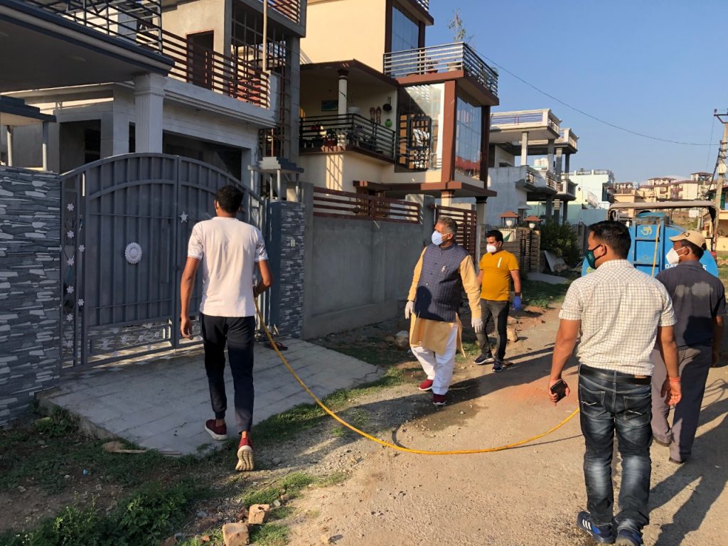 देहरादून : कोविड संक्रमण से बचाव गतिविधियों की माॅनिटरिंग हेतु देहरादून जिले के प्रभारी एवं कैबिनेट मंत्री गणेश जोशी ने शुक्रवार को देहरादून के ग्रामीण क्षेत्रों में सेनिटाइजेशन की स्थिति का जायजा लिया। विलासपुर कांड़ली, जैंतनवाला एवं चांदमारी एवं जमुनापानी क्षेत्र में पहंचे प्रभारी मंत्री द्वारा कोविड महामारी से प्राथमिक तौर पर बचाव हेतु संक्रमणरोधी दवा के छिड़काव की स्थिति देखी। काबीना मंत्री द्वारा अपने सामने ही टेंकर मंगवा कर संक्रमणरोधी दवा (सोडियम हायपोक्लोराईड साल्युशन) का छिड़ाकाव करवाया।