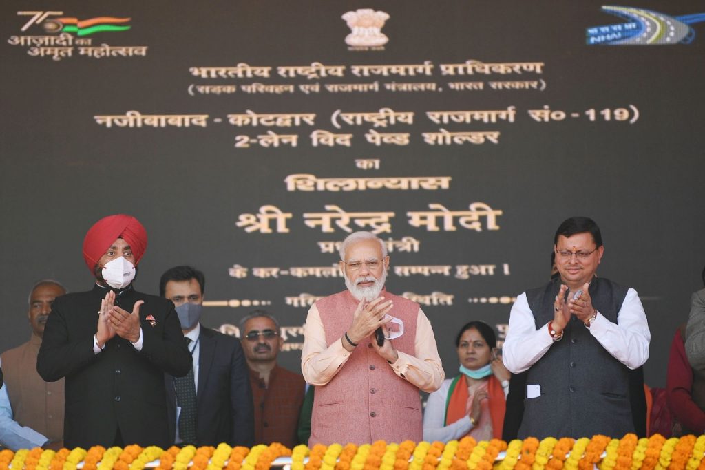 प्रधानमंत्री नरेन्द्र मोदी ने पुष्कर सिंह धामी को युवा, लोकप्रिय और ऊर्जावान मुख्यमंत्री बताते हुए कहा कि उनके नेतृत्व में उत्तराखण्ड के विकास का हर संकल्प पूरा होगा। राज्य में युवा नेतृत्व के साथ वरिष्ठ नेताओं की अनुभवी टीम है। उन्होंने कहा कि 2025 में उत्तराखण्ड अपने रजत जयंती वर्ष में विकास के नये आयाम प्राप्त करेगा। कोविड-19 के टीकाकरण अभियान में उत्तराखण्ड का देश के अग्रणी राज्यों में शामिल होने पर भी उन्होने मुख्यमंत्री पुष्कर सिंह धाम को बधाई दी। इससे पूर्व प्रधानमंत्री ने एन.एच.ए.आई. द्वारा संचालित योजनाओं के साथ ही अन्य योजनाओं पर आधारित प्रदर्शनी का भी अवलोकन किया।